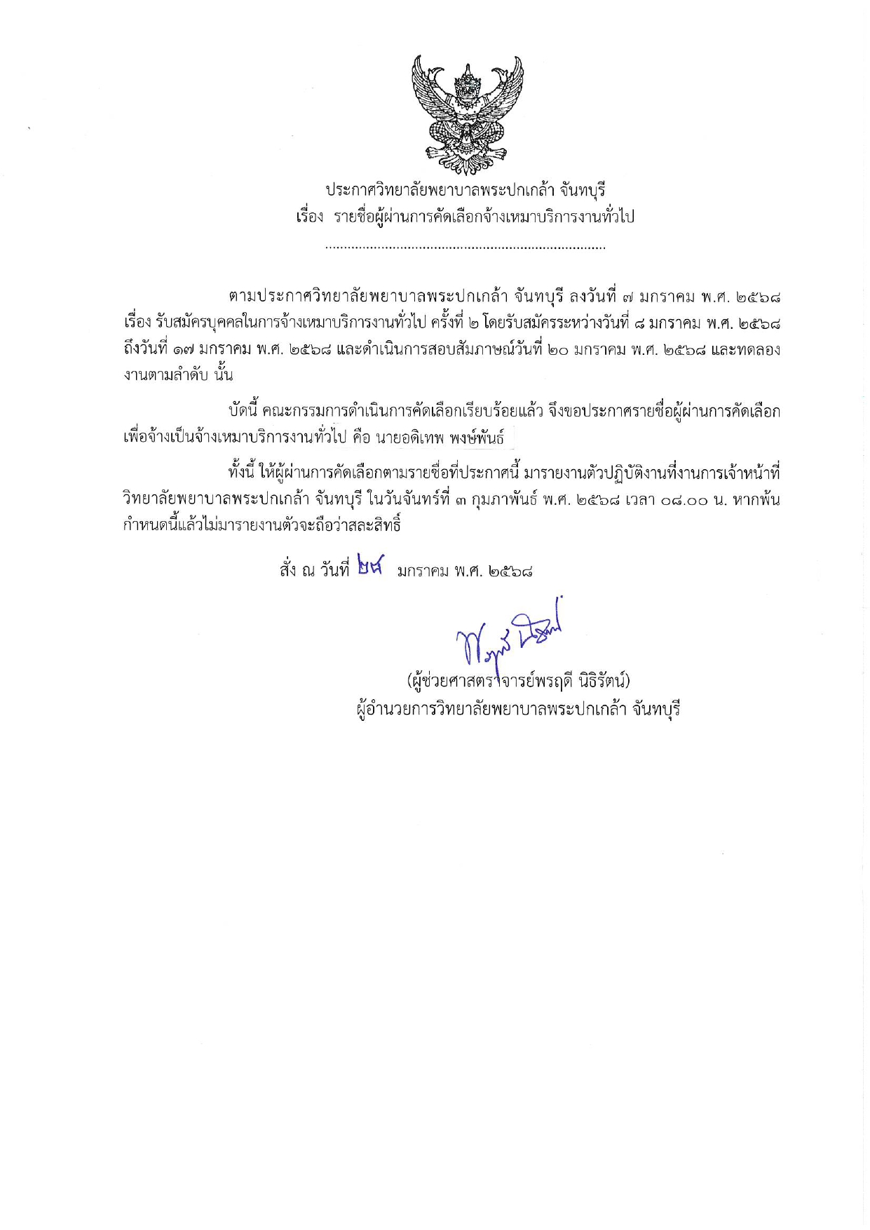 ประกาศรายชื่อผู้ผ่านการคัดเลือกจ้างเหมาบริการงานทั่วไป